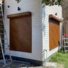 La contraventana encaja en el vano bajo el dintel. Los rieles laterales y la cortina de listones caen contra la ventana.